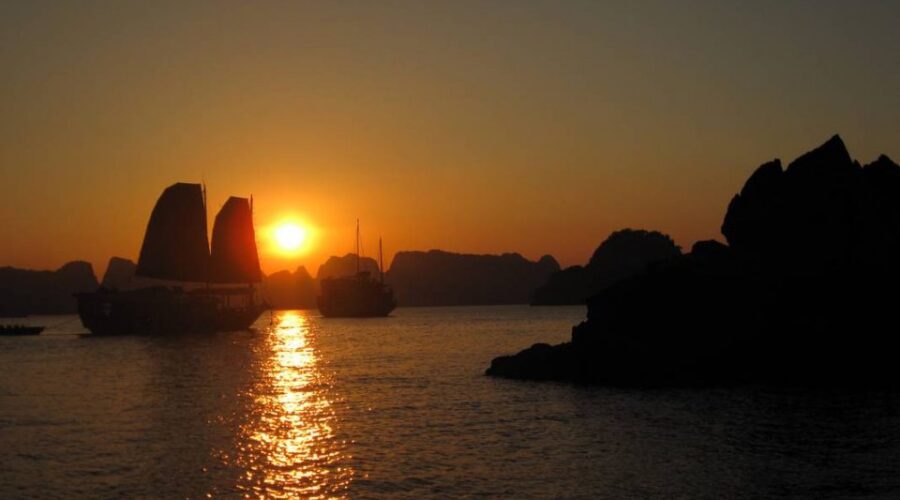 17.30-18.00     Back on board, you will join the Sunset party & cooking class while the ship heads towards shore. Guests can enjoy relaxing moments while drinking a cup of traditional Vietnamese tea or coffee on the sun deck amidst wonderful views and beautiful sunsets. Halong Bay is quiet during the day, but when the sun goes down, the Bay becomes even quieter and more peaceful.